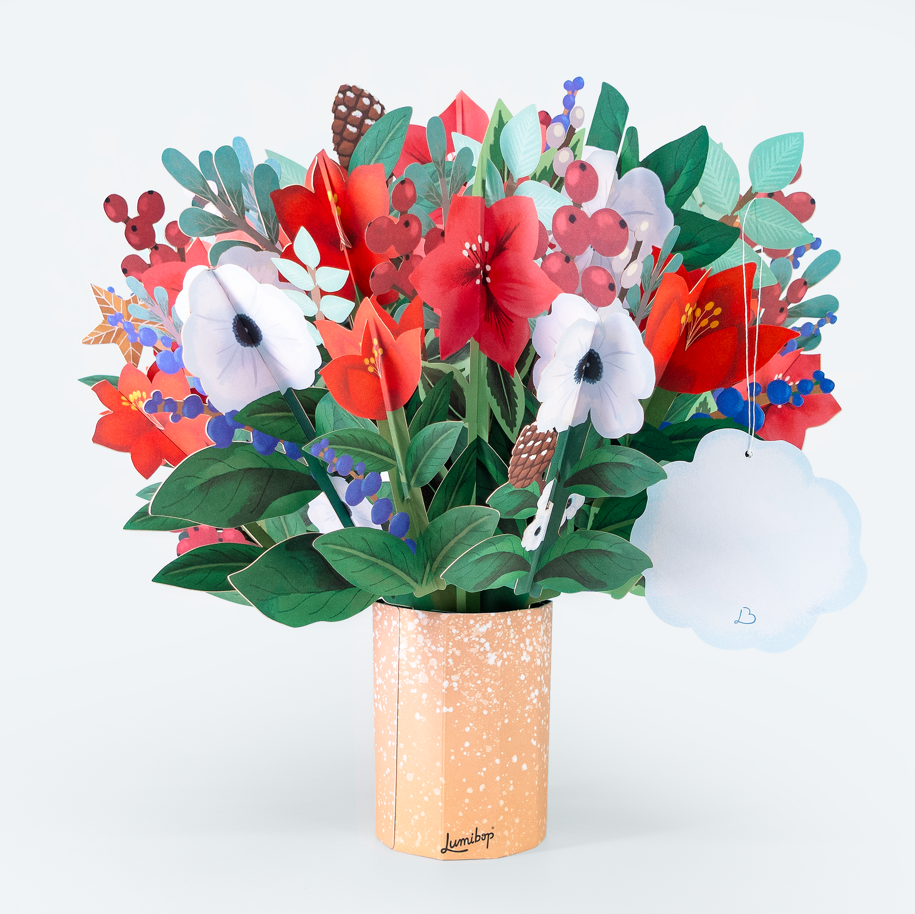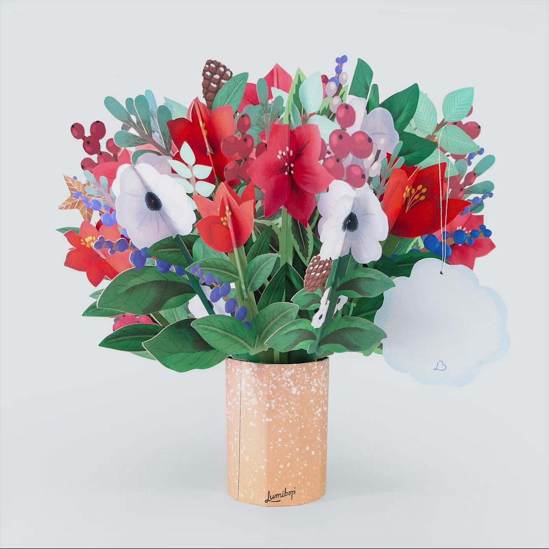 Send a Christmas surprise that blooms right out of the envelope. This exquisite pop-up bouquet card unfolds to reveal a stunning, three-dimensional winter arrangement, perfect for displaying throughout the festive season.