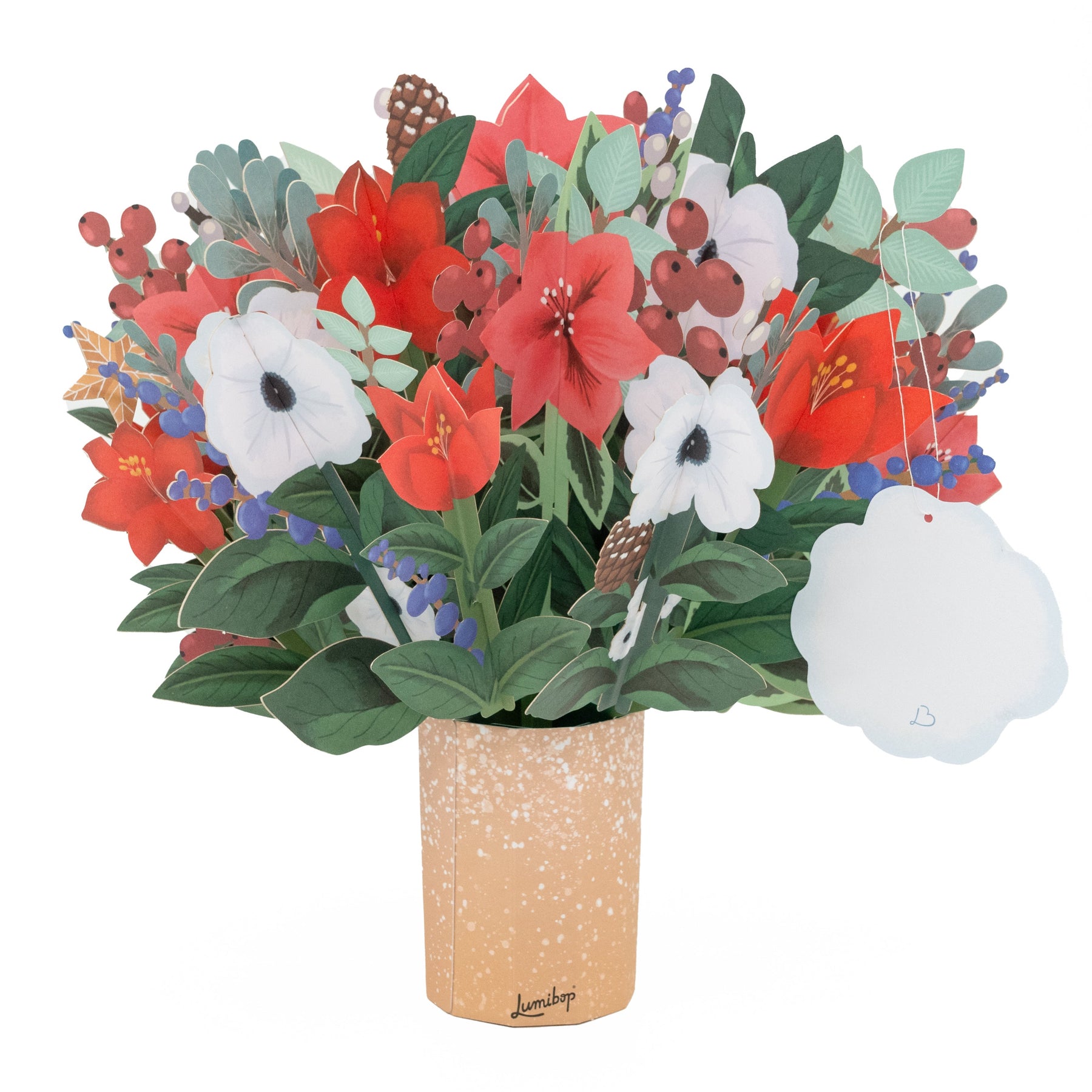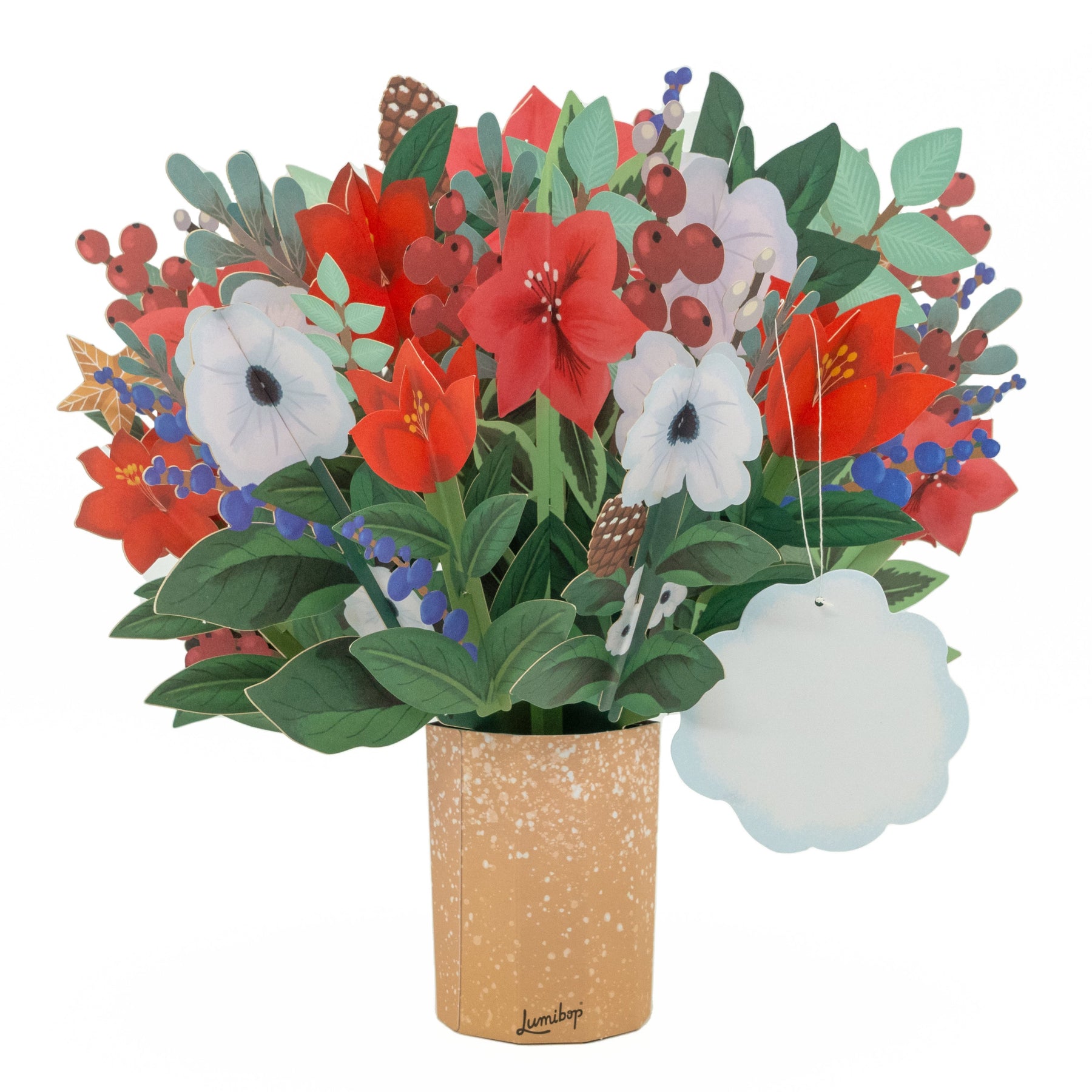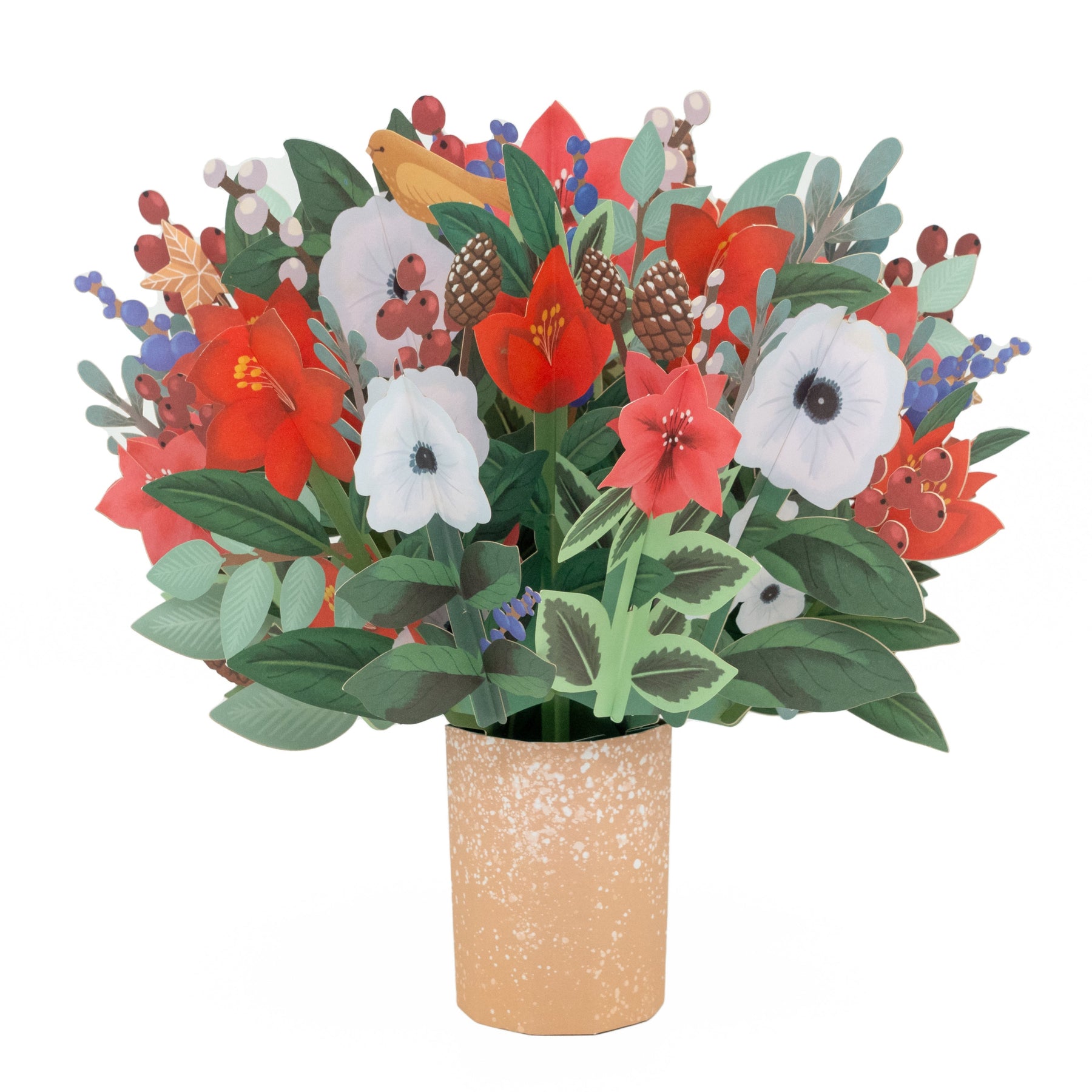 From Flat To Open: To open, squeeze the vase sideways and push the bottom inwards until the card is secured. To close, push from both sides to pop the bottom out again and allow the bouquet to flatten.